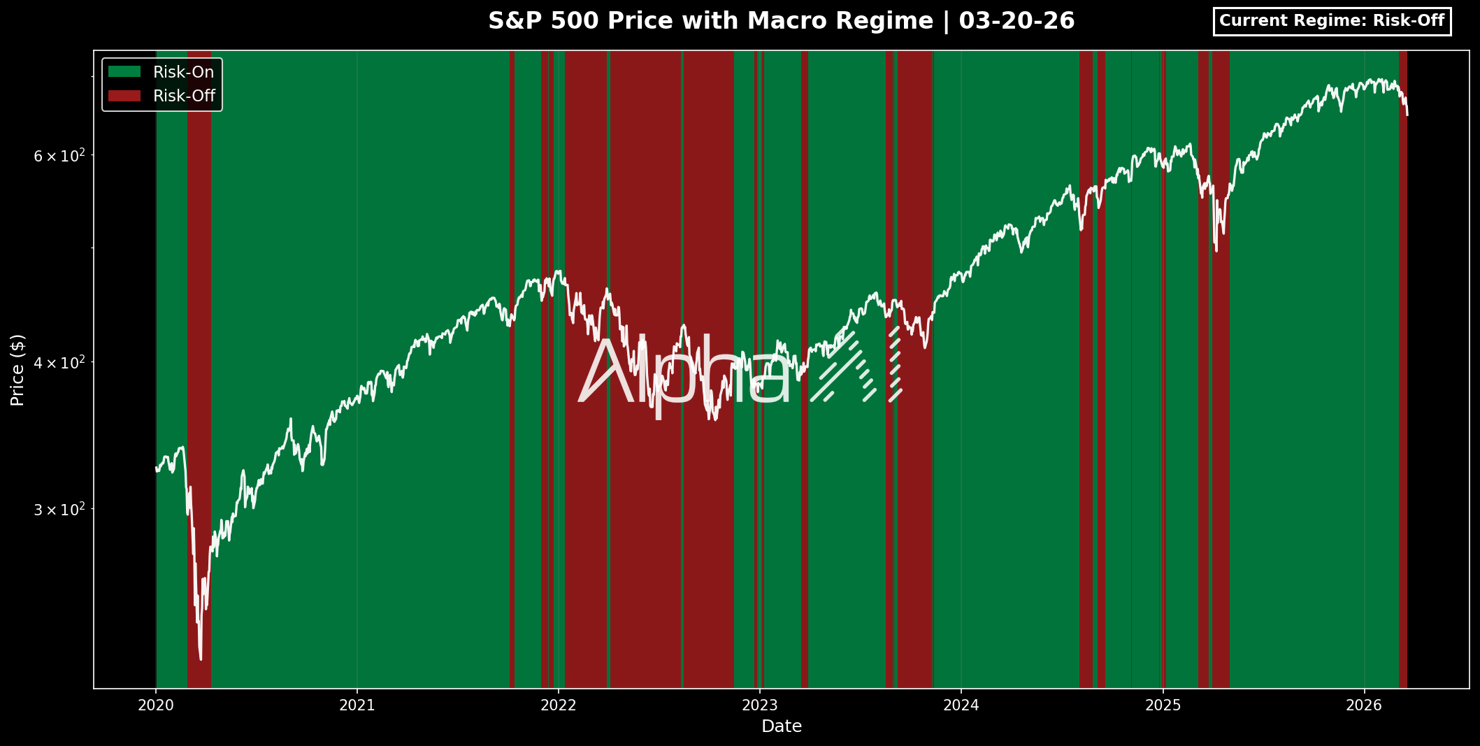 Risk-on or risk-off. Reads monetary policy, fiscal flows, dollar strength, and global liquidity to produce one clear signal. When green, deploy. When red, protect. Capital preservation first.
