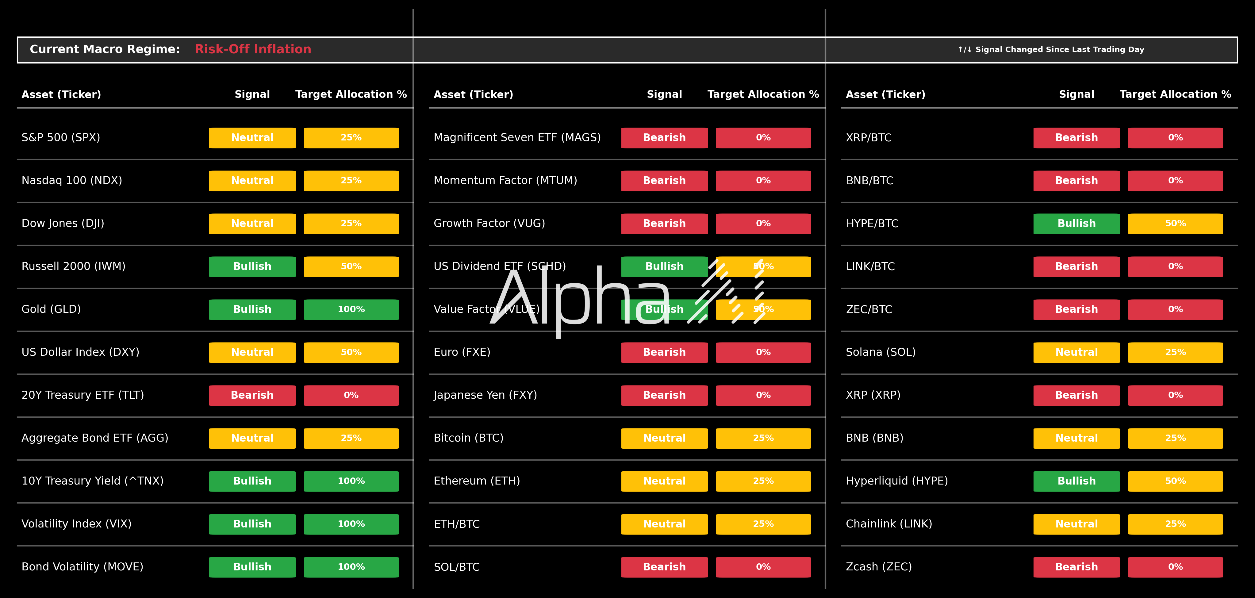 Daily signals across equities, crypto, sectors, commodities, currencies. Each gets a signal and target allocation. No guesswork.